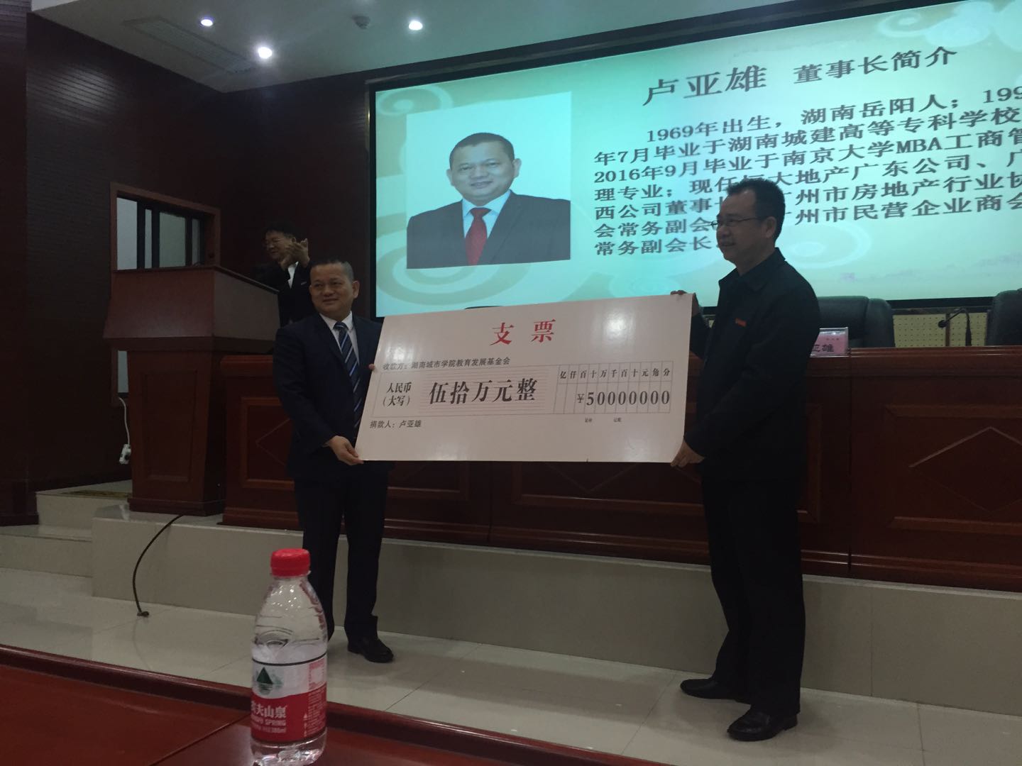 校友卢亚雄1992年毕业于我校原湖南城建高等专科学校工民建专业,现任恒大地产广东、广西公司董事长,广州市房地产行业协会副会长,广州市民营企业商会常务副会长。毕业20多年来,卢亚雄情系母校,关心支持母校建设和发展。今年6月30日,卢总出席湖南城市学院第二届理事会换届暨产教融合论坛,现场决定向母校个人捐赠50万元设立“卢亚雄奖学金”,用于奖励母校品学兼优的莘莘学子。